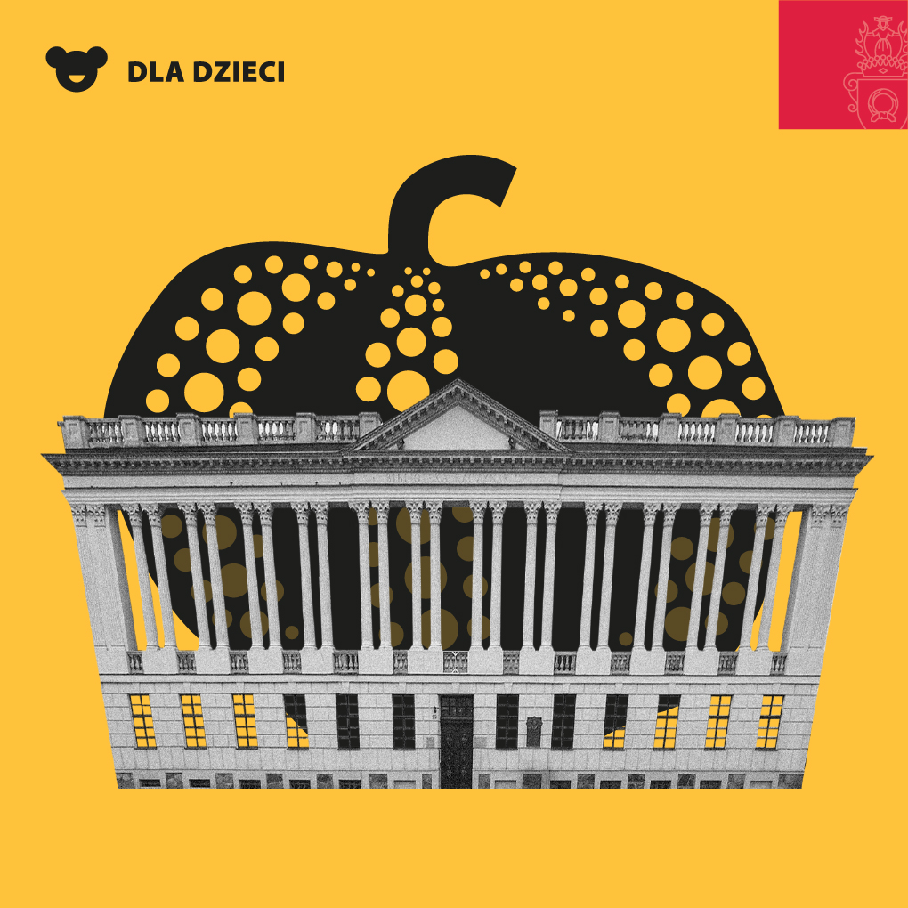 Grafika przedstawia wielką czarną dynię, wyłaniającą się z zza budynku Biblioteki Raczyńskich