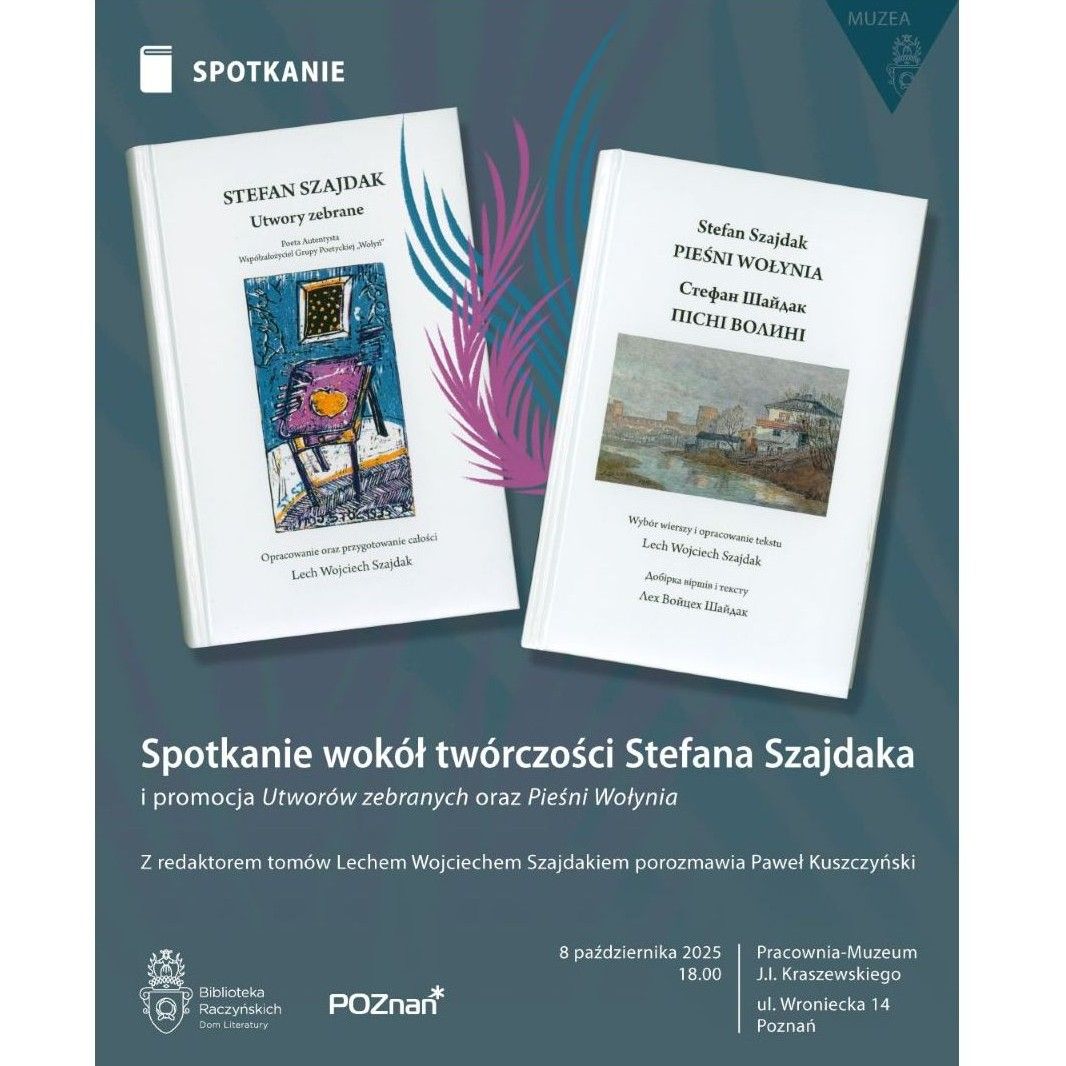 Dom Literatury Biblioteki Raczyńskich zaprasza na spotkanie poświęcone twórczości Stefana Szajdaka, poety autentysty, współzałożyciela Grupy Poetyckiej „Wołyń”. O pracy nad spuścizną literacką ojca opowie prof. Lech Szajdak, redaktor m.in. „Utworów zebranych” oraz „Pieśni Wołynia”. Spotkanie poprowadzi Paweł Kuszczyński, prezes Związku Literatów Polskich w Poznaniu.