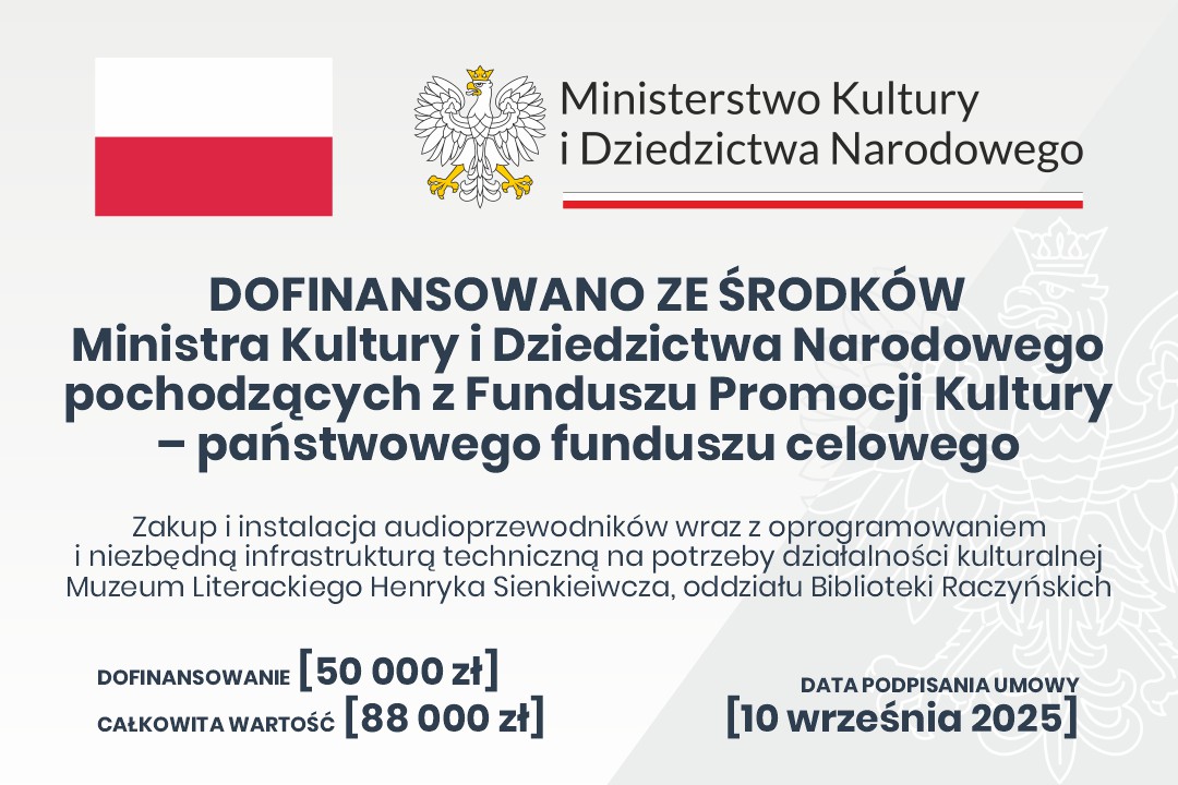 Dofinansowane zadanie polega na zakupie i instalacji audioprzewodników wraz z oprogramowaniem i niezbędną infrastrukturą techniczną. System audioprzewodników obejmie zwiedzanie wystawy stałej oraz wystaw czasowych w Muzeum Literackim Henryka Sienkiewicza, oddziale Biblioteki Raczyńskich. Z zakupionego sprzętu korzystać będą w przyszłości zwiedzający posługujący się językiem polskim, wybranymi językami obcymi, a także osoby ze szczególnymi potrzebami, w tym z niepełnosprawnościami słuchu, wzroku i intelektualnymi. Inwestycja zwiększy potencjał edukacyjno-animacyjny zwiedzania, uatrakcyjni dotychczasową ofertę kulturalną i znacząco wpłynie na jej dostępność.